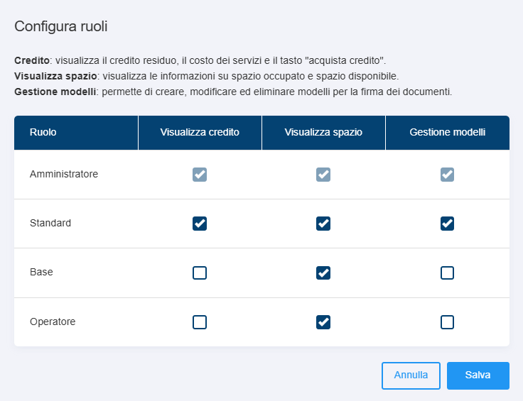 Posso decidere a quali ruoli rendere visibili le informazioni su credito e spazio?